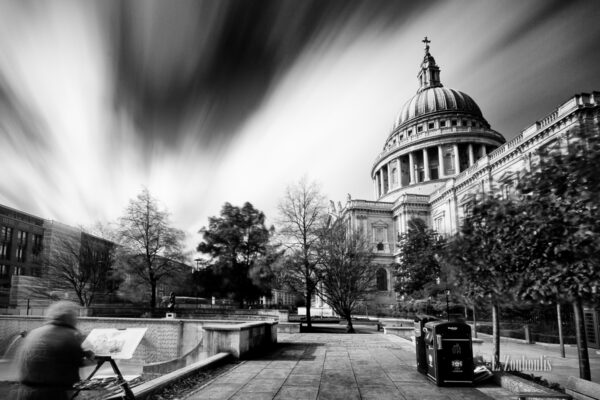 Ein Künstler vor der monumentalen St. Paul’s Cathedral, eingefroren in einem urbanen Strudel aus Licht und Zeit. „The Artist“ vereint kunstvolle Langzeitbelichtung mit menschlicher Präsenz – ein Bild, das nicht nur Architektur, sondern auch Atmosphäre einfängt. London in Schwarzweiß – still, lebendig, voller Charakter.